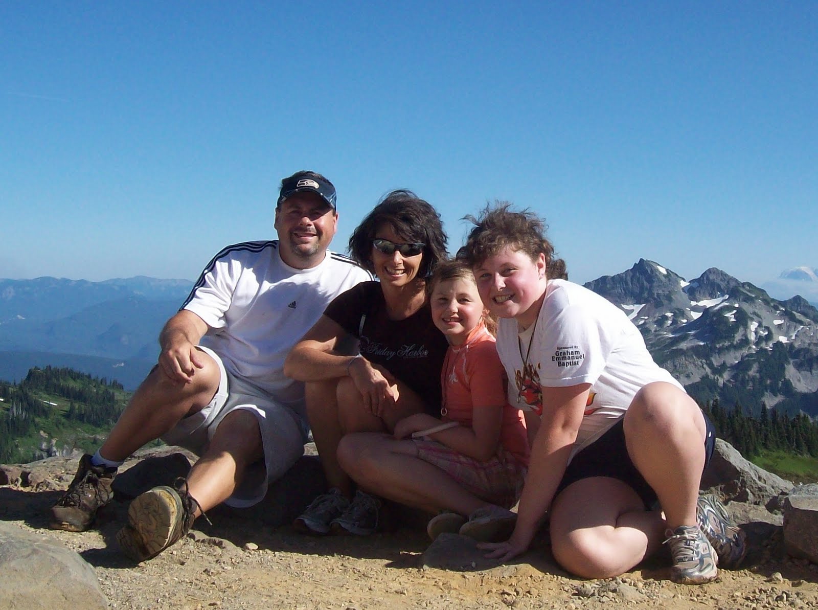 Last year, Vicki and I were so proud of our girls for hiking with us on some of the beautiful trails out of Paradise @ Mt. Rainier. We took two trips two weeks apart in Aug. '09. The first trip featured beautiful high mountain meadows in rare form. The fragrance alone told you this was a piece of heaven. Added bonuses included high glacier-covered peaks that loomed ahead of us on Mt. Rainier (Glacier point) and the views of distant Cascade peaks such as Mt. St. Helens, Mt. Adams and in the far distance Mt. Hood in Oregon. It was spectacular!